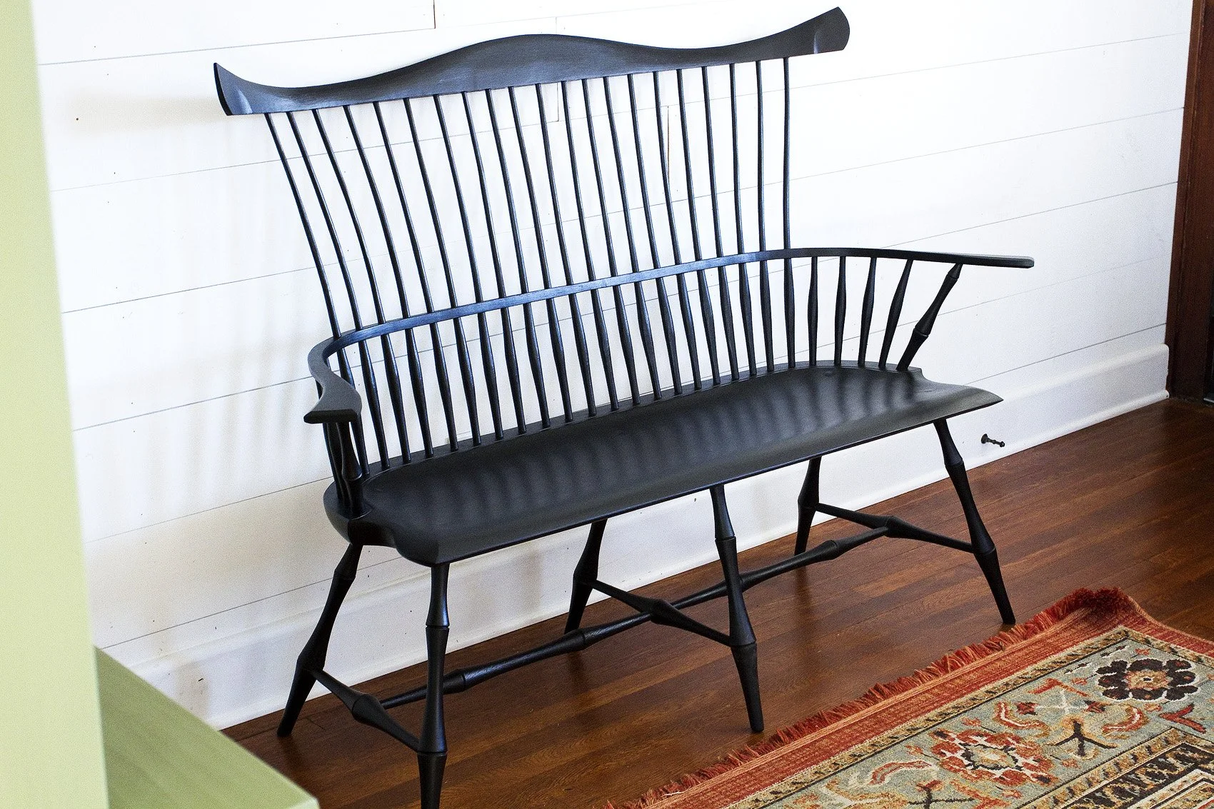 Hand-carved White Pine seat, hand-shaped spindles, steam bent Hickory arm and crest, black milk paint